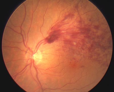 Bild eines Venenastverschlusses: Oben sieht man links als gelben Fleck den Sehnervenkopf und aus seiner Mitte die austretenden Blutgefäße (Arterien und Venen, vergleiche Netzhautbild). Eine Vene ist jetzt verstopft (Bereich des besonders dunklen roten Fleckes). Durch Stau, der mangels Abflußmöglichkeit besteht, tritt Blut aus den Gefäßen vor der Thrombose aus und fließt in die Netzhaut (der gesamte fleckig rötliche Bezirk auf dem Bild). In diesem Bereich ist das Sehen stark eingeschränkt und die Netzhaut wird geschädigt.